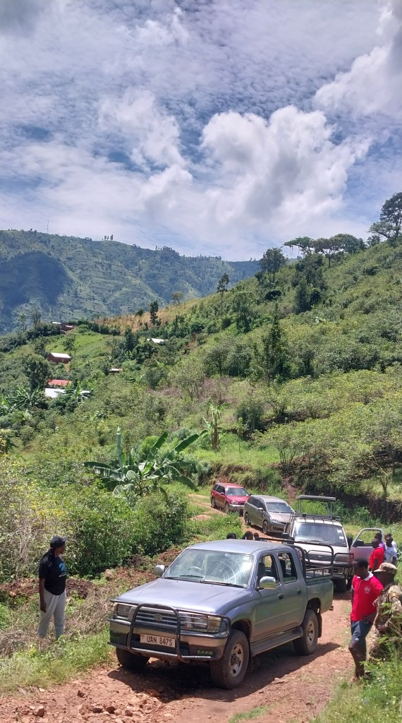 With game rangers we headed for the mountains through trading centers such as Muramba and Kisamba trading centers. Between Muramba and Kisamba, the terrain changed, we were now ascending the Rwenzoris. We had challenges at many hills where our cars could not climb and required us to come out to push the cars in teams. Cars engines heating up powering hot water on us, the car I was in later poured all water and could not move any further, we had to walk all the remaining distance to join our colleagues to the planned parking place. What kept us motivated was the fact that we were already seeing the waterfalls from a distance.