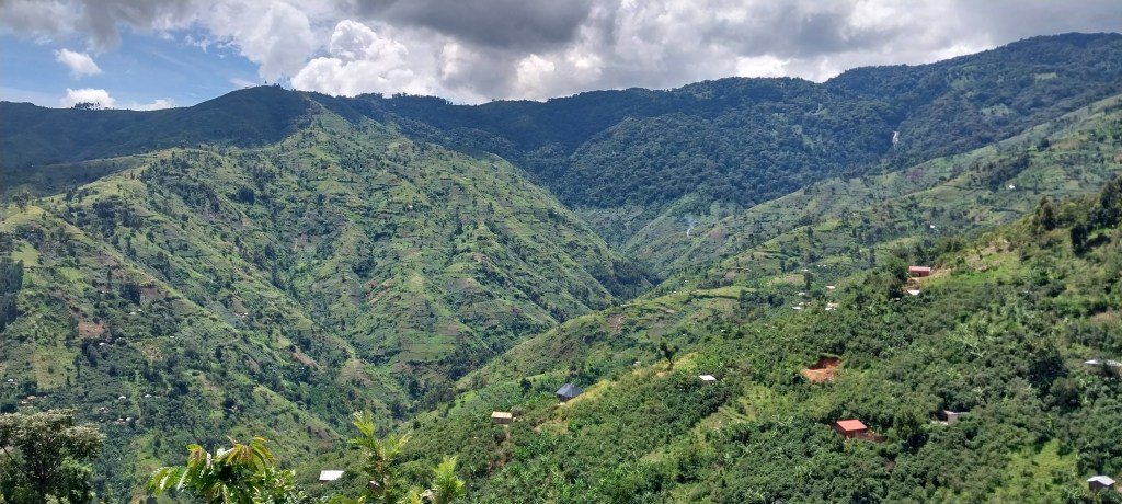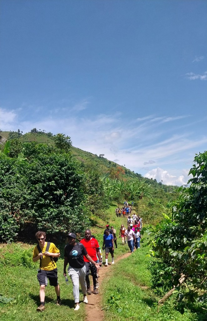 Local guides welcomed us to Kisamba and got us ready for the hike to the waterfalls. The route to the falls seemed easy at the start as we walked through homesteads with good views of the mountains and the lower plains. We could hardly understand how challenging to was going to become ahead. Our local guides ahead of us, UWA rangers with us, people who started together from the same point started to stretch and by the time we entered the forest the front person was two kilometers from the last person. We trekked through the local community with coffee and Cassava gardens on the sides of the pathways. Shared brief smiles and greetings with the local residents who kept encouraging us to continue. A number of children from the community joined us on the journey as some of them had been going there before.