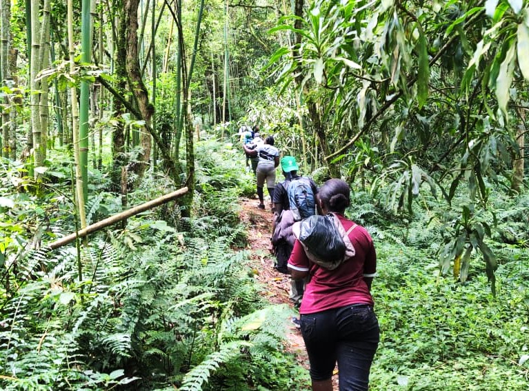 A quick thirty-minute drive, punctuated by spirited chatter, led the troupe to Kicwamba College, nestled humbly at the very base of the majestic Rwenzoris. Here, their ranks were bolstered by the valiant presence of UPDF soldiers, guardians of the green, whose steady gaze and sure footing would guide them through the forested heart of the mountains. With a shared nod, a collective surge of energy, the hiking began! Each step was a testament to teamwork, a promise whispered from one to another: “No one left behind!”